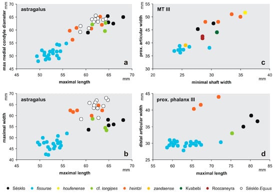 The studied specimens were measured with precision of 0.1 mm, when possible. The measurement methodology of the equid material follows Eisenmann et al. []. Inaccurate measurements, due to bad or incomplete preservation, are enclosed in parentheses. Measurements on incompletely preserved specimens may be given as ‘greater-than’, using the relevant sign (>).