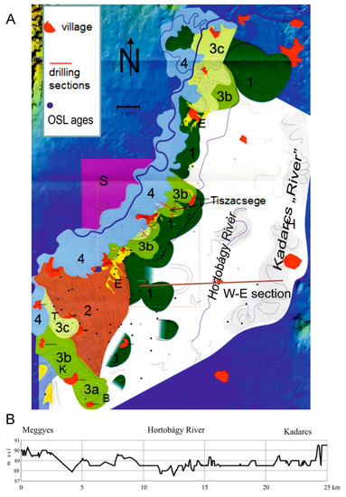 (A) Morphological map of the middle Tisza area. H: Hortobagy system; E: aeolian forms (yellow); 1–4: fluvial systems (see text); 3a-b-c: Berekfurdo (B), Kunmadaras (K), Tiszaörs (T) meanders in the lower left corner (from Mol et al. [10]); S: Sajo alluvial fan; W-E section, see B; (B) topographic W-E section through the Hortobagy plain (white color in A), including the old Kadarcs system, and the Meggyes meander (system 1 of the younger valley belt).