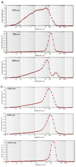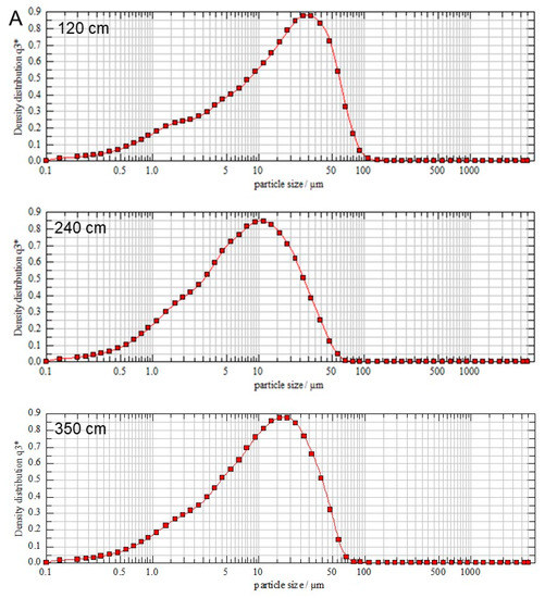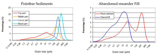 Detailed grain-size information from the point-bar series and the channel fill is represented in Figure 4. An upward decreasing grain size typifies the sands of point bars [66]. The upper flood sediments generally contain a fraction with a mode around 40 µm (the red (top sediment) curve in the left diagram of Figure 4), which is the typical mode for loess deposits in this region [67,68], thus easily interpreted as reworked (alluvial) loess deposits [69]. In addition, the flood sediment often also contains a sand fraction (most obvious in the right panel of Figure 4) indicating some flow on top of the previous floodplain [69,70]. The channel fill shows a clear bimodality (Figure 4, right panel): one fraction is a fine silt of c. 19 µm, corresponding with the fine component in the regional loess cover [67,68] and preferentially settled in the standing water of the abandoned meander, in contrast to the coarser-grained silt (40 µm) which is dominant in the flood sediments; the second fraction is a clay (c. 2 µm) which can only be deposited by settling in standing water (‘lacustro-aeolian loess’ [69]).