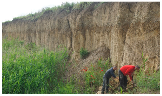 Top of the section at Zrenjanin in the upper sediments of a large meander. Notice the chernozem soil at the surface and a soil at 1.7–2.00 m depth with prismatic structure. Sampling depth (base of exposed section) is at 6.90 m.