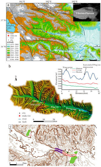 (a) Overview of the study area derived from ASTER Global Digital Elevation Model (ASTER GDEM) data. The black lines show the faults (modified after the 1:500,000 geological map). (b) Detailed morphological features (gorges and depressions) of the study area and the location of the study section (red star). The Huangshui River flows through a series of gorges and depressions. The swath profile (AA’ in yellow rectangle) shows detailed elevation change of the study area and the Xiao gorge and Ping’an depression. The black lines show the faults (modified from []). (c) Geomorphological sketch map of the studied area, showing the terrace and fan (plain green: terrace; green hatched lines: fan; red: erosion of the terrace and the fan after deposition; purple: V-shaped incision of the Huangshui in the Xiao gorge).