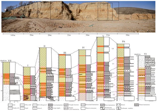 The upper part of the succession in unit 6 (U6) is characterized by abundant layers of structureless sandy silt and silt (Fm) interbedded with thin reddish-brown fine laminated silt (Fl), forming a broadly fining-upward succession (Figure 12). Carbonate nodules occur locally within facies Fl. The thickness of each coarser-silt layer ranges from 1.7 m to 7 m and the thin finer-silt layers are up to 0.5 m thick. U6 is well exposed in section V, with a maximum thickness of 8.7 m.