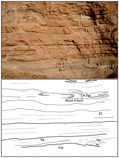 Considering the extent of horizontally laminated sand over tens of meters and the grain-size distributions of samples II-4, IV-1, and VII-1, we attribute the U2 sand sheets to moderate-energy, shallow sheet flows, capable of forming plane lamination in the upper flow regime. The predominant reddish mud layers represent lower energy flows from which fine suspended sediment settled out, and the occasional root traces and carbonate nodules indicate phases of stability and weak post-depositional pedogenic modification as temporary interruptions in deposition []. The observed poorly developed soil and desiccation cracks may also indicate the temporary sub-aerial exposure of shallow channels on the alluvial fan []. The small fine clay fraction (<1 µm) is probably due to soil formation in accordance with the presence of root traces and carbonate nodules. Sample II-3 from a silt bed with carbonate nodules contains a relatively high fraction of <1 µm clay, which supports this hypothesis.