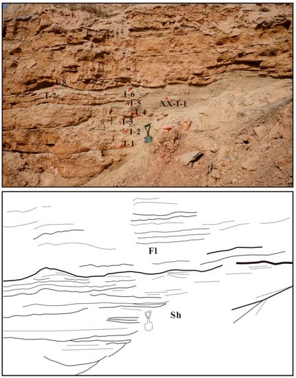 The horizontally laminated, trough and planar cross-bedded, and ripple cross-laminated facies (Sh, St, Sp, Sr) in U2 are interpreted as fluvial in origin. The abundance of horizontal lamination (Sh) indicates a common transition to an upper-flow regime. The local presence of cross-beds (St, Sp) may represent channel deposits of two- and three-dimensional dunes within low-energy channels, commonly as minor channels on gravel sheets at the top of unit 1 and within units 2–5 []. The ripple cross lamination (Sr), locally present at the bed tops, implies the gradual waning of flow, typically at the end of flood events [,].