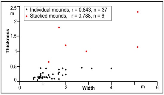 At several levels, up to six mounds separated by thin clay layers are stacked near-vertically, to a maximum height of 2.3 m and width of 5.14 m, with a positive correlation between thickness and width (Figure 7 and Figure 8). The width/thickness ratio of the stacked mounds ranges from 0.9 to 2.9. One stack of mounds shows a slight lateral drift in the crest position of individual mounds through time.