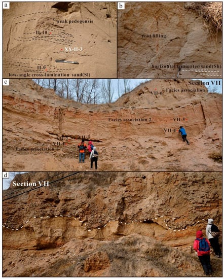 In total, 11 OSL samples and 45 grain-size samples were taken from facies association 2 (Table 2), with the positions of some samples shown in Figure 4e and Figure 11a–e.
