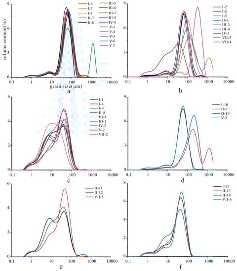 The grain-size distribution of samples taken from U3–U6: samples from (a) the sand mounds, (b) sand layers, and (c) silt layers in U3; from (d) sand sediments in U4; from (e) U5 (II-11 and VII-5 from silt layers and II-12 from a sand layer, and (f) massive silt sediments in U6.
