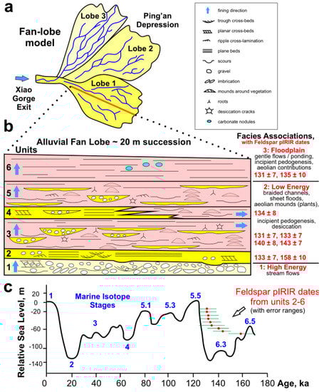 Model for alluvial fan development at Ping’an: (a) framework of sediment supply from the Xiao gorge exit, rapid accumulation, and intrinsic fan evolution as a result of lobe elevation and switching; (b) summary of the fan succession; and (c) correlation of OSL dates with marine isotope stages [].