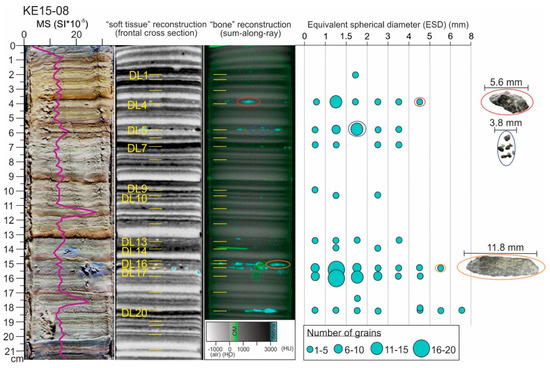 From left to right: Photograph of core KE15-08 with enhanced colour histogram to increase the visibility of the varves with a superimposed record of magnetic susceptibility (MS) in purple. Frontal cross -section of the “soft tissue” reconstructed image. X-ray computed tomography (CT) “sum-along-ray” (equivalent to inverted radiograph) image of the “bone” reconstructed image stack of the same core; laminated (varved) mud is shown in grey scale (intermediate HU), debris in blue (high HU), and organic material in green (low HU). Each layer that contains debris in this core is labelled by DL (debris lamina) and the layer number. The number of grains per equivalent spherical diameter (ESD) class is shown on the right. Pictures of selected grains from three layers.