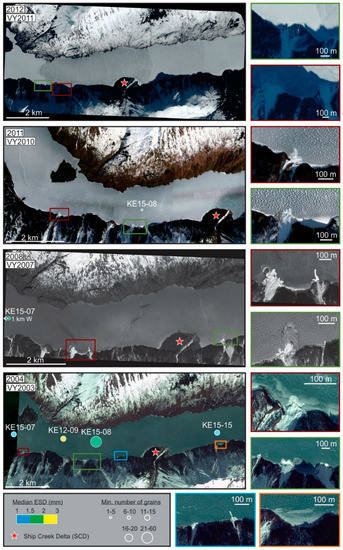 The satellite images from Kenai Lake in the month of April over several years show that snow avalanches were deposited on the lake almost every year. However, not every varve contains debris. In years with large snow-avalanche deposits, such as 2004, a debris deposit is present in several cores throughout the lake, whereas smaller avalanche deposits, like in the years 2012 and 2014, are not always represented by debris in one of the sediment cores (Figure 4). The satellite images of these years show that the avalanche deposits are not reaching as far onto the lake ice as they do in other years, and it is possible that during cracking of the ice along the shore, part of the deposit already ends up near the shore [10]. As a result, these snow avalanches are not recorded in the cores taken in the middle of the lake. The 2014 satellite image (Figure 3) shows that ice cracks form around some of the avalanche deposits along the south shore. It is likely that these deposits will not detach from the shoreline, resulting in deposition of the debris on the slopes. Furthermore, depending on which shore of a lake (i.e., shady or sunny—the northern shoreline of Kenai Lake receives more sunlight every day then the south shore, thus lake ice will melt first along the north shore) a snow avalanche is deposited, the debris may or may not get redistributed by drifting ice across the lake.