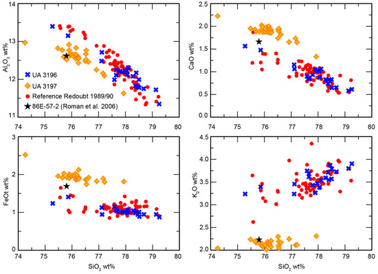 Plots of glass geochemistry of unknowns and reference data. UA 3196 plots with all elements with the reference data for the 1989/90 eruption of Redoubt [25]. Data from Roman et al. [27] of the Augustine eruption are the average of five analyses. Unfortunately, no standard deviation or standards are provided in the paper. However, the analyses for this population identified in the 1986 eruption are similar to UA 3197. All analyses, including standards, are available as supplementary materials (Table S1).