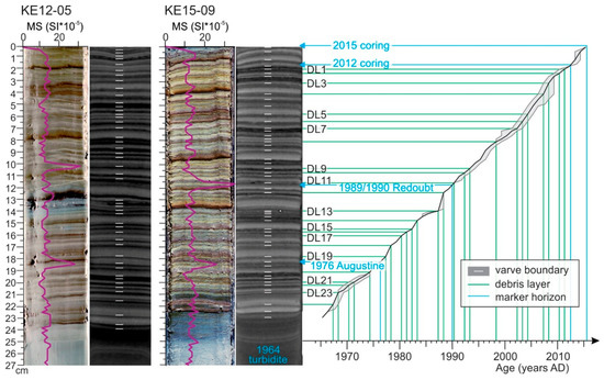 The cores containing debris were correlated by marker horizons and the sequences of varves present in each core. Varves containing debris were marked as debris laminae (DL) followed by the number of the layer, starting at the sediment–water interface and counting downwards to the top of the turbidite deposited in response to strong shaking during the 1964 earthquake [17]. Dating of the different debris laminae was based on the varve chronology, corroborated by tephra marker beds. The different varves are formed in varve years (VY), which start at the beginning of the melting season (spring) and end at the end of winter [13,18], e.g., VY2014 starts approximately in May 2014 and ends in April 2015.