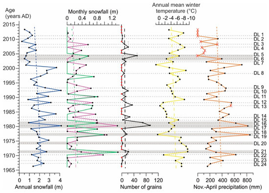 Climate variables, such as mean, maximum and minimum monthly temperature and monthly snowfall (data from the Alaska Climate Research Center), were compared to grain-size distributions and the number of grains from all debris laminae. Baggi et al. [35] suggested that a snowpack is weakened by 1) gradual warming of the snowpack to 0 °C, 2) loss of strength by water infiltration into the snowpack, and 3) overload of the (wet) snowpack by precipitation. These weakening factors of the snowpack could trigger a wet-snow avalanche. In Kenai Lake, we can link the presence of a debris lamina to a varve year where there was snow precipitation in a month with a mean temperature above 0 °C (Figure 9). For example, in 1980 (varve year 1979) a high amount of snow fell in months with a mean temperature above 0 °C and in this varve year, DL17—the debris laminae with most grains of the record—was deposited.