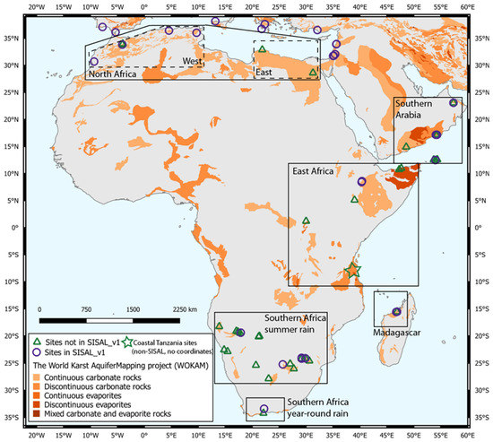 Speleothems are secondary cave carbonates and provide valuable archives of past hydroclimates. In this review, we focus on the speleothem record from Africa, using the Speleothem Isotopes Synthesis and AnaLysis version 1 database (hereafter, SISAL_v1) [1,2] as a starting point. We include southern Arabia and Madagascar as part of the African region. Africa covers an area of over 30 million km2 and makes up 20% of the Earth’s land surface. It is also the only continent to stretch from the northern temperate to the southern temperate zones, which should theoretically allow an exploration of latitudinal migrations of climatic belts. However, the density of speleothem records is much smaller than in other regions. The paucity of records is partly due to the underlying bedrock geology, which is dominated by Precambrian basement rocks, with little outcrop of carbonates or evaporites (Figure 1) [3]. Drylands and deserts cover 60% of Africa’s land surface [4], which reduces the potential for formation and preservation of speleothem records.