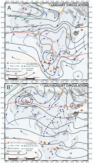 Regional climate and circulation patterns showing the boundaries of the Intertropical Convergence Zone (ICTZ), Congo Air Boundary and Mid-Latitude westerlies (adapted from [80]) and including locations of speleothem records (open circles represent those included in SISAL_v1; triangles represent sites not included in SISAL_v1): (A) January; and (B) July/August.
