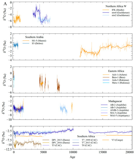 In the paleoclimate record, African speleothem δ18O mostly ranges from +1 to −9‰ except for Dante Cave in northwestern Namibia where isotopic values reach lower than −10‰, possibly because of the inland location of the site. In northern Africa, the Holocene records from Iflouki, La Mine and Gueldaman Caves show δ18O signatures close to present Mediterranean precipitation δ18O [158]. The large variability of δ18O values at Gueldaman Cave indicates variable moisture conditions including prominent dry periods during the late-Holocene. The Arabian records (Hoti, Qunf, Defore and Moomi Caves) show generally slightly more enriched δ18O values than the northern African records. We also find more isotopic enrichment at Defore Cave compared to Hoti, Moomi and Qunf Caves. This offset confirms that the Arabian and Mediterranean sites are not within the same precipitation system and reflects the short transport distance between Arabian sites and the Indian Ocean. From Arabia southwards to eastern Africa, δ18O becomes more depleted (Figure 6A). This spatial pattern may reflect the amount effect commonly observed in monsoonal rainfall [159]. Even during phases when the ITCZ is in a northern position rainfall amounts are lower at the fringes of the monsoon influence (southern Arabia) than in its centre (equatorial eastern Africa), which would lead to the overall higher δ18O values observed in southern Arabia (Figure 6A). The inverse pattern is however not observed in sites to the south of the equator, with southern African sites (Cold Air Cave, Wolkberg Cave, Buffalo Cave, Lobatse Cave and Cango Cave) all recording δ18O values of around −5‰. While this may well be due to sampling bias, it also hints at mechanisms other than the position of the ITCZ and the amount effect driving the δ18O values.