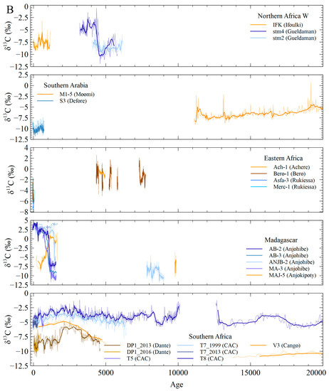 The δ13C values of African speleothems range from ~3‰ to −10‰ (Figure 6B). δ13C values in northern African records range mainly between −10‰ and −5‰ and reflect higher abundance of C4 grasses and/or stronger PCP associated with cool/dry conditions [44,49,51]. Speleothem records from southern Arabia and eastern Africa show a trend towards more positive values closer to the equator (Figure 6B). In southern Africa, δ13C values at Dante Cave are comparatively low (~−5 to −10‰) [31,62], which also may reflect the inland location of the site. The South African sites (Cold Air Cave, Wolkberg Cave, Buffalo Cave, Lobatse Cave and Cango Cave), to some extent, show a similar trend as the southern Arabian and eastern African sites with decreasing values with increasing distance from the equator (Figure 6B). This tendency in the data is unexpected, because higher temperature and rainfall in the tropics should lead to lower speleothem δ13C [51]. This inversion of the expected trend may arise from differences in gas exchange within the cave, which is considered important in Ethiopia [20].