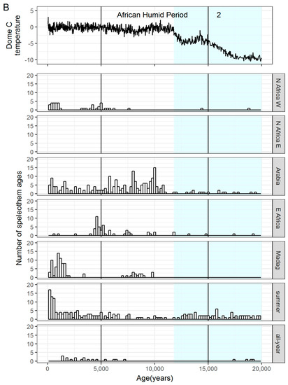 Age distribution histograms of ages measured on speleothems separated by regions indicated in Figure 1 (Southern African summer and year-round rainfall regions are abbreviated as “summer” and “all-year”, respectively): (A) for the last 500 ka; and (B) for the last 20 ka. In both panels: temperature reconstructions (relative to present day) from EPICA Dome C ice core in Antarctica [119]. Light blue shading marks glacial intervals. Numbers at the top of (A) indicate MIS intervals. Vertical lines in (A) mark the boundaries of the African Humid Period.