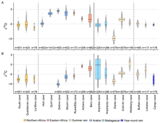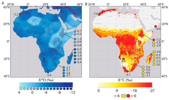 Modern isoscapes and recent speleothem stable isotope values: (A) speleothem δ18O (circles) on interpolated map of Global Network of Isotopes in Precipitation mean annual δ18O [153,154]; and (B) speleothem δ13C (circles) on modelled plant δ13C [155] based on MODIS data [152]. δ13C map colours are blank in Africa where there is little or no vegetation and outside of Africa where the model was not run. Speleothem stable isotopes are the mean of the most recent five measurements for each stalagmite growing at any point during the last 2000 years. Speleothem colours are on an identical scale as the modern isoscape for δ18O, but divided either side of −6‰ for δ13C (based on [156]), as there is substantial fractionation between leaf cover and speleothem calcite, and it has not yet been established how speleothem δ13C responds to mixed C3/C4 vegetation above the cave [156,157].