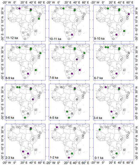 African speleothem isotope variability during the last 12,000 years. All plots show mean δ18O in 1000-year bins. Colours indicate positive δ18O (purple), negative δ18O (green), low mean δ18O or multiple speleothems at one cave showing contrasting results (grey), or no recorded speleothem growth (white).