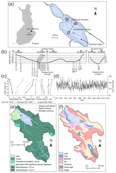 Lake location, sampling transects, water quality and water level data, and drainage basin: (a) Location of and sampling transects through Lake Lehmilampi. Dashed lines show the northwest (AB) and the southwest transects (BC). The star denotes the sampling point in the southern basin. (b) Coring sites and core codes along both transects are shown as a function of bathymetry. (c) Water quality monitoring data of Lake Lehmilampi (Cond.: electrical conductivity). The lake has been frozen in April 3rd, 1975 and in February 24th, 1992. The lake has been free of ice in August 26th, 1998. (d) Water level data of neighboring Lake Pielinen. Lake levels are expressed as height (cm) above an arbitrary zero level at the monitoring location. (e) Land use types of the Lake Lehmilampi drainage basin [51,52,53]. Isobaths are expressed in meter below lake surface, and elevation contour values are expressed as meters above sea level. (f) Superficial geology of the Lake Lehmilampi drainage basin [51,52,54].