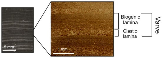 The sediments at the two deepest basins of Lake Lehmilampi are varved, representing seasonal changes in sediment accumulation [40]. The basic varve structure is composed of clastic and biogenic laminae (Figure 2). The clasts are eroded from the catchment and transported into the lake by spring floods following snowmelts. As a consequence, a sharp contact is typical between the dark-colored organic lamina and the following light-colored clastic lamina, whereas the contact is gradual between the clastic lamina and the following biogenic lamina [40]. The biogenic lamina is composed of autochthonous and allochthonous organic matter deposited during the growing season from summer to autumn [40,41]. The thickness of biogenic lamina depends on the primary production rate, transport of autochthonous biogenic material, preservation, and degradation [42]. Preservation and degradation are closely linked to hypolimnetic oxygen concentrations [43,44]. According to an earlier study [45], varve preservation in the northern basin of Lake Lehmilampi started approximately 5100 BP when the lake became isolated from Lake Pielinen.