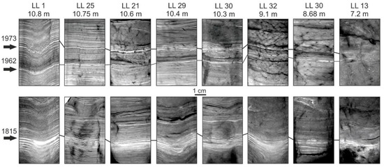X-ray images representing core correlation based on variations in lithological marker horizons and the succession of varves. The arrows point at clastic laminae that were formed in 1815, 1962, and 1973 as easily discernible components of marker horizons.