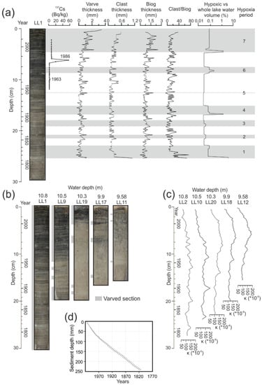 Core LL1 from the deepest point of the northern basin was dated using varve counting and considered as the master core, because of its undisturbed and continuous varve record. A similar record has also been observed in earlier studies of the northern basin [40,45]. Radiometric dating was performed for core LL1 to verify the accuracy of varve counting. 137Cs activities were measured with a BrightSpec gamma spectrometer on wet sediment samples of 11–30 g with 3600 s counting time at the Geological Survey of Finland. Each wet sediment sample integrated two varve years.