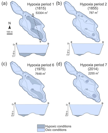 First year of occurrence and volume of hypoxic waters (in m3) for (a) hypoxia period 1 in 1815, (b) hypoxia period 2 in 1855, (c) hypoxia period 6 in 1975, and (d) hypoxia period 7 in 2014. Bathymetric cross-sections along the dashed line DE show hypoxic (darker color) and oxic conditions (lighter color). Water depths 7–11 m in the transects are exaggerated by a factor of 25 to better visualize the variations in hypolimnetic hypoxia.
