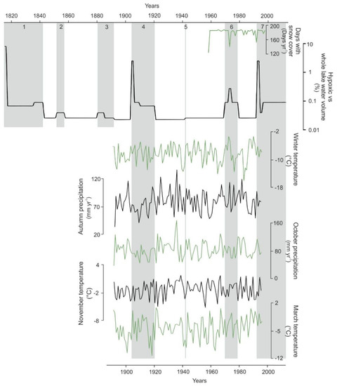 The climate seems to be an important driver of changes in Lake Lehmilampi during the last 200 years despite human influence, because the recent diatom assemblage change is likely related to a warming climate, and several statistically significant correlations were found between climate variables and hypoxia volume (Table 4). These correlations reflect relationships between yearly, seasonal, and monthly variations and do not take into account single extreme events or possible time lags between climate forcing and responses in hypolimnetic hypoxia. Nevertheless, increased hypoxia volumes seem to coincide at least with milder winters and drier Octobers (Table 4). Climate controls the alternating stratification and overturn periods in boreal lakes [86], which also affect oxygen availability. Therefore, it is not unexpected to find correlations between climate variables and hypoxia volumes. Dry Octobers could reduce the intensity of autumn overturn via diminished runoff of oxygen-rich water into the lake. However, the positive correlation between hypoxia volume and winter temperature is interesting and unexpected, because cold winters typically extend ice cover, which weakens circulation in the lake through thermal stratification and reduces oxygen availability in bottom waters [16]. The mechanisms beyond these correlations cannot be explained using our data and remain as topics for further investigations.