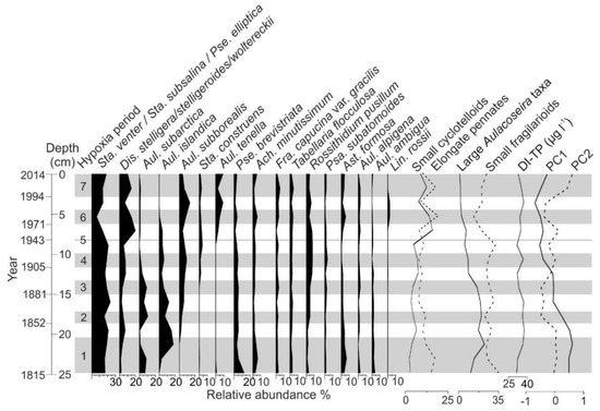 The diatom assemblages of core LL1 changed during the past 200 years, while DI-TP remained relatively stable (Figure 8). The diatom assemblage change is characterized by an increase in the relative abundance of small cyclotelloid taxa and elongate pennate taxa and a decrease in large Aulacoseira taxa and small fragilarioid taxa towards the present day. PC1, i.e., largest variation in the diatom data, correlates negatively with large Aulacoseira taxa (ρ = −0.93, p-value < 0.01) and benthic fragilarioid taxa (ρ = −0.55, p-value = 0.04). Small cyclotelloid taxa have a positive correlation with PC1 (ρ = 0.80, p-value < 0.01). PC2, i.e., second largest variation in diatom data, correlates positively with elongate pennates (ρ = 0.66, p-value = 0.01). DI-TP does not correlate (p-value > 0.05) with PC1 or PC2.