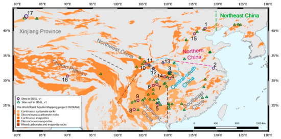 Map showing the location of speleothem records in China, superimposed on a map showing the distribution of carbonate and evaporite rocks provided by the World Karst Aquifer Mapping Project (WOKAM [30]). Purple circles indicate cave sites with speleothem records that are available in SISAL_v1 [18] (1: Kulishu; 2: Hulu; 3: Sanbao; 4: Heshang; 5: Dongge; 6: Yangkou; 7: Furong; 8: Xiaobailong; 9: Zhuliuping; 10: Huangye; 11: Dayu; 12: Suozi; 13: Jiuxian; 14: Xinya; 15: Xinglong; 16: Tianmen; 17: Kesang). Green triangles show cave sites identified, but not included in SISAL_v1.Specific information on sites, entities, and references is given in Table 1.