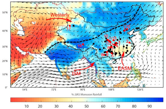 Long-term (1981–2010) percentage of summer precipitation (June–September) based on the 1.0° × 1.0° gridded gauge-analysis data from the GPCC (Global Precipitation Climatology Center [38]). Wind data at 850 hPa (June–September) are from MERRA (Modern-Era Retrospective analysis for Research and Applications [39]) database. Red and black dots are the locations of speleothem δ18O records discussed herein (details in Table 1). Cave locations numbered 1–17 (red dots) are the same as in Figure 1. “EASM”, “ISM”, and “Westerly” denote regions mainly influenced by the East Asian summer monsoon, Indian summer monsoon, and Westerly climates, respectively. The regions located around 110° E represent the interaction area between ISM and EASM. The modern ASM limit is shown by the black, dashed line, as in Chen et al. [40]. Numbers indicate cave sites of records in SISAL_v1 (1: Kulishu; 2: Hulu; 3: Sanbao; 4: Heshang; 5: Dongge; 6: Yangkou; 7: Furong; 8: Xiaobailong; 9: Zhuliuping; 10: Huangye; 11: Dayu; 12: Suozi; 13: Jiuxian; 14: Xinya; 15: Xinglong; 16: Tianmen; 17: Kesang). See Table 1 for details of each record.