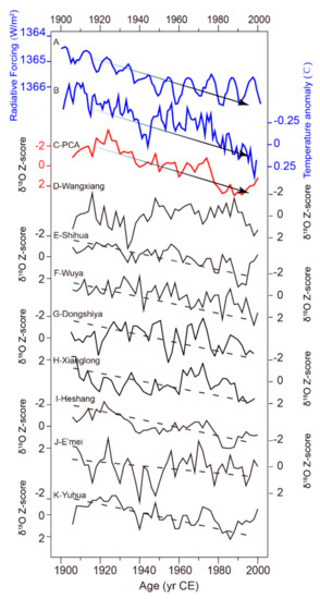 High-resolution speleothem δ18O records from China with the solar radiation and global temperature curves for the 20th century. (A) Solar radiation [242]; (B) Temperature anomaly (data from National Centers for Environmental Information); (C) First Principal Component of the speleothem δ18O records in (D–K); (D) Wanxiang Cave [10]; (E) Shihua Cave [128]; (F) Wuya Cave [150]; (G) Dongshiya Cave [50]; (H) Xianglong Cave [246]; (I) Heshang Cave [15]; (J) E’mei Cave [54] and (K) Yuhua Cave [178]. Speleothem records in (D–K) have resolutions higher than 2 years. Dotted lines in (D–K) show the long-term trend of each speleothem record. Principal Component Analysis has been done on speleothem δ18O converted to standard Z-scores using the software Origin Pro 2016. All axes are reversed.