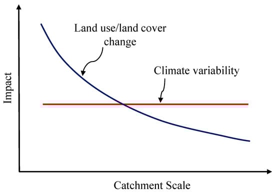 Many places in the world are hotspots of risk from extreme weather-related events; and disaster risk are likely to increase due to a combination of land-use/land-cover changes, population growth, climate change, and development activities []. Flood risk, climate change and social change have increasingly become a global concern, and also, vulnerabilities related to land use change and climate change have, potentially, a very strong effect on catchment hydrology, floods and damages. Based on previous literature, Blöschl et al. [] hypothesized the impact of climate and land-use/land-cover changes on hydrological response as a function of catchment scale as shown in Figure 1, which shows that sudden changes in the watershed response can occur due to land use/land cover change []. The impact of climate change on magnitude and frequency of floods has been widely investigated [,,]. Similarly, numerous researches focused on study on the impacts of land cover changes on watershed hydrological response [,,,], however, only a few of them focused on analyzing the impact of land-cover change in river floods using distributed hydrological modeling [].