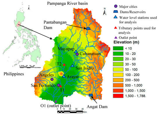 The Pampanga River basin, which is located in the Region III (Central Luzon) of the Philippines, is the fourth largest basin in the Philippines. Figure 2 shows the location map, basin boundary and digital elevation model (DEM) with elevation ranges of the study site. The catchment area of the study site is approximately 10,645 km2 (based on digital elevation model of study area) and the length of the main Pampanga River is about 260 km. About 95% basin area lies in Nueva Ecija, Tarlac, Pampanga, and Bulacan provinces of the Region III, while the remaining 5% area is part of the other seven provinces of the Region III such as Aurora, Zambales, Rizal, Quezon, Pangasinan, Bataan, and Nueva Vizcaya [,]. The average annual precipitation in the basin is 2155 mm []. There are two multi-purpose dams in the basin such as the Pantabangan dam (storage capacity of 2966 million m3) and Angat dam (storage capacity of 850 million m3). There are also two swamp areas in the river basin such as Candaba (250 km2) and San Antonio (120 km2) [].