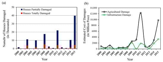 Flood damage during past flood events in the Region III of the Philippines (a) number of houses damage and (b) estimated cost of agricultural and infrastructure damage [Data source: Office of Civil Defense Region III, the Philippines].