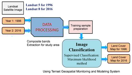 For land-cover change analysis, Landsat images were used because of their rich archive and spectral resolution []. In order to generate land-cover maps for past years, Landsat satellite images of 30m spatial resolution were acquired from the EarthExplorer database of United States Geological Survey with less than 10% cloud cover searching criteria for land cloud cover and scene cloud cover. Based on visual comparison of the images for cloud free or less cloud coverage images, Landsat 8 scenes acquired on 13 February 2016 for the year 2016 and Landsat 5 scenes acquired on 25 March 1996 for the year 1996 were selected for the land-cover classification in the study area. Pre-processing of the Landsat images were conducted using TerrSet Geospatial Monitoring and Modeling System (TGMMS). The raw digital number (DN) values of each band of the images were calibrated and converted to reflectance values, and the bands of the images were also corrected for atmospheric haze with dark object subtraction model in the TGMMS.