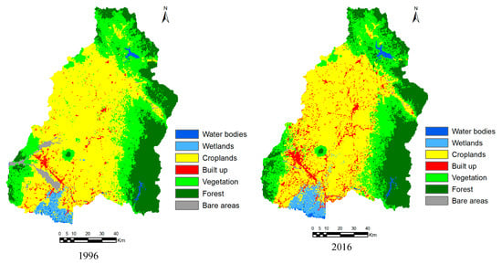 There are normally two methods of image classification, i.e., supervised and unsupervised classification. Supervised classification can generate desired classes of land-cover based on ground-truth data, while unsupervised classification attempts to classify the pixels with the same characteristics based on statistical criteria [,]. In this study, a supervised classification method was used, in which training samples and spectral signatures of known categories, such as urban, croplands, vegetation, forest and others, have to be developed. Then image classification tool in the TGMMS assigns each pixel in the image to the land-cover type to which its signature is most similar. The maximum likelihood classification method was used for image classification, which is one of the most effective algorithms for classification of satellite images [,]. The land-cover categories in the basin were classified into seven classes as presented in Table 1. The training samples for each land-cover class for 1996 and 2016 were selected as many as possible throughout the entire image based on composite images as well as google earth images. About 672 training samples (water bodies: 49, wetlands: 70, cropland: 330, built-up areas: 114, vegetation: 58, forest: 22, bare land: 29) were selected for land-cover class for 1996, while about 1128 training samples (water bodies: 99, wetlands: 103, cropland: 552, built-up areas: 245, vegetation: 80, forest: 30, bare land: 19) were selected in the case of 2016 (Table 1). After making training samples for 1996 and 2016, signature files were created by processing Band 1 to Band 6 using the IDRISI image processing tool in the TGMMS. Then, by using signature files, land cover maps for the years 1996 and 2016 were generated based on maximum likelihood classification method. The generated land-cover maps of 30m spatial resolution were upscaled to 450m spatial resolution, same as spatial resolution of DEM used for hydrological analysis, using ArcGIS 10.3.1 (Esri, Redlands, CA, USA). The generated land-cover maps were compared visually with google earth images. For the fully or partly could coverage areas, generated maps were manually corrected based on Google Earth images using raster editor in ArcGIS 10.3.1 (Redlands, California). Figure 6 shows the generated land cover maps for the years 1996 and 2016. The accuracy assessment of generated land cover maps was also performed by checking random samples of land cover class with google earth images. The overall accuracy and kappa value for 1996 land cover were about 87.3% and 0.806, while they were about 86.5% and 0.801 in the case of 2016 land-cover map. The generated land cover maps for the years 1996 and 2016 were in perfect agreement with high value of overall accuracy and kappa value. The land-cover maps show that the cropland and built-up areas were mostly located in the region with 0–50 m altitude and a slope of 0–5 degrees. The vegetation and forest areas were densely located in the region where the altitude is greater than 200 m. The wetlands areas were mostly located in the coastal areas where water covers the land throughout the year because of the effect of sea/tidal level.