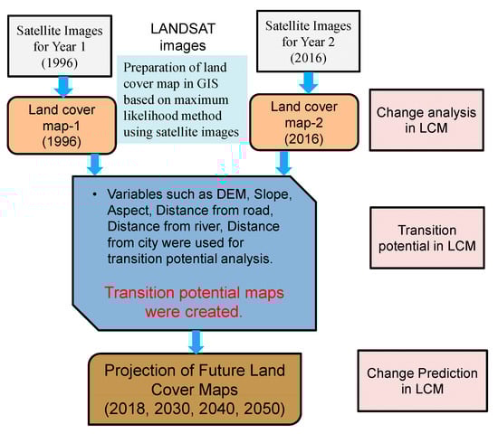 The land-cover maps for past years were generated using Landsat images based on supervised-maximum likelihood classification method and land cover changes in the past years were analyzed. The generated land-cover maps were validated by comparing these with Google Earth images. The land cover maps for the future were predicted using LCM based on the analysis of potential transition changes and considering various variables such as elevation, slope factors, aspect factors, distance from the city, distance from the major road, and distance from the river. Then, flood characteristics were analyzed using the RRI model developed by Sayama et al. [] with land cover map for different years. The RRI model was calibrated and validated by comparing calculated flood discharge with observed discharge for past flood events, and calculated flood marks were also compared with recorded flood depth data. The impacts of land-cover changes on flood runoff, and flood inundation were analyzed for 50- and 100-year floods. The potential affected areas caused by flood hazards were also analyzed with different years land cover data. The details of methodology and data used are discussed below.