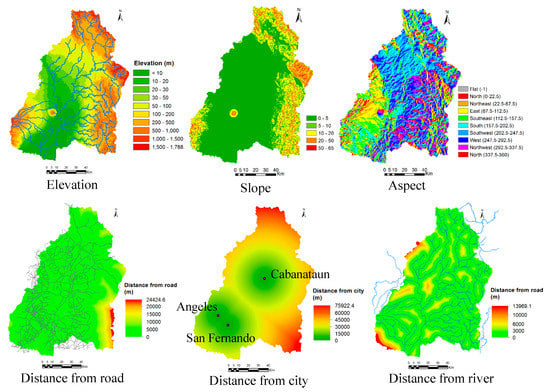 Figure 7 shows the process of land cover change analysis, transition potential analysis and prediction of land cover maps for the future. To predict land cover maps for future years, land cover changes between the years 1996 and 2016 were analyzed using the LCM tool of TGMMS. The potential for land transitions was modeled using transition sub-model of LCM with similarity-weighted instance-based machine learning tool (SimWeight) []. Six transitions such as cropland to built-up, cropland to vegetation, vegetation to cropland, vegetation to built-up, vegetation to forest, and forest to vegetation, were considered for potential transition modeling. The changes in water bodies, wetlands and bare areas were neglected for future projection of land-cover maps. The variables such as elevation, slope, aspect, distance from the road, distance from the city centre, and distance from the river as shown in Figure 8 were also considered as static variables in the potential transition modeling. Then, land-cover maps were predicted for years 2018, 2030, 2040 and 2050 based on historical rates of change and the transition potential model. The projected land-cover map for year 2018 was used only for validation of the projected map, and the land-cover maps for years 2030, 2040, and 2050 were used for impact analysis of land cover changes on flooding regime. The land use plan of local governments was not considered in prediction of land-cover maps for future dates, because of limited information and data. The LCM tool of TGMMS can predict a future scenario of land cover for a specified future year based on the historical rates of change and the transition potential modeling []. The LCM model determines how the variables influence land cover change in the future, how much land-cover change took place between year 1 and year 2, and then calculate a relative amount of transition to the future year [].