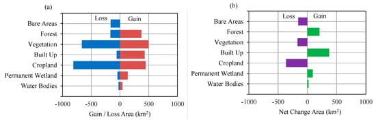 Gain and loss area of each land cover class from 1996 to 2016 (a) gain/loss area and (b) net change area.