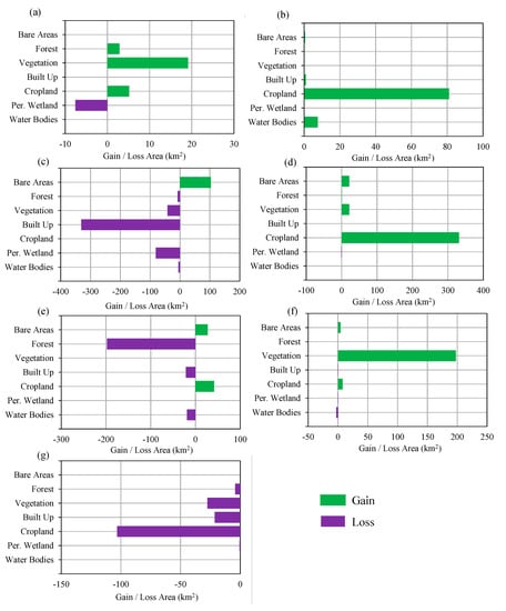 Contribution to net change from 1996 to 2016 in (a) water bodies, (b) permanent wetland, (c) cropland, (d) built-up areas, (e) vegetation, (f) forest, and (g) bare areas.
