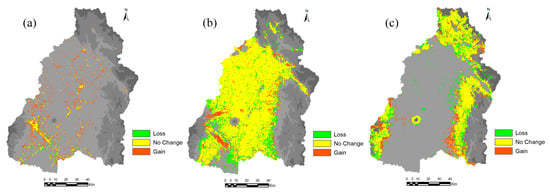 Distribution of loss, no change and gain areas between 1996 and 2016 for land-cover class (a) Built-up areas, (b) Cropland areas, and (c) Vegetation.