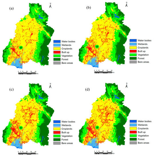 Projected land-cover map for (a) 2018, (b) 2030, (c) 2040, and (d) 2050.