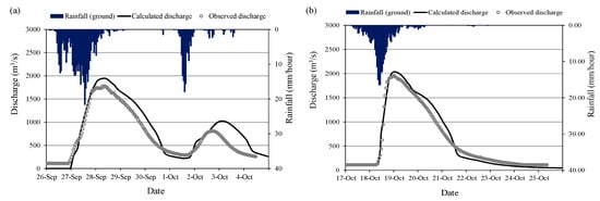 Calculated and observed discharge at San Isidro for (a) 2011 flood and (b) 2015 flood.