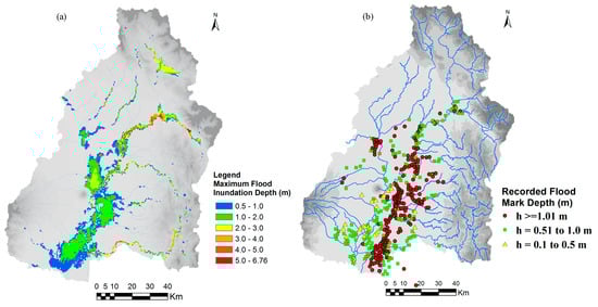 Comparison of calculated flood inundation with reported data for flood event of September 2011 (a) calculated flood inundation extent and depth and (b) recorded flood mark depth (Data source for recorded flood mark: PRFFWC []).