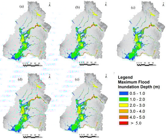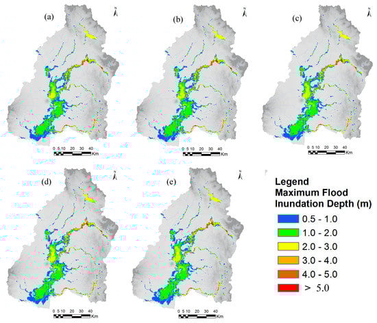 Calculated flood inundation depth and extent areas with different year land-cover maps in the case of 100-year flood (a) 1996, (b) 2016, (c) 2030, (d) 2040, and (e) 2050.