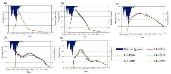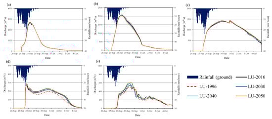 Comparison of calculated flow discharge with different year land-cover maps at selected stations and tributary streams in the case of 50-year flood (a) Mayapap station, (b) San Isidro station, (c) Arayat station, (d) T1 (tributary 1), and (e) T2 (tributary 2).