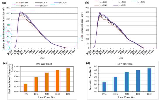 Figure 19a,b show the temporal changes in flood inundation volume and flood extent areas with different year land-cover data in the case of 100-year flood. Figure 19c shows the peak value of flood inundation volume, and the total flood extent areas during the flood event are presented in Figure 19d. The results show that flood inundation volume, peak value of flood volume and flood extent areas may increase in the future due to land-cover changes, particularly due to rapid urbanization of three main cities and expansion of built-up areas along the roads by converting cropland and vegetation areas into built-up areas. The peak value of flood inundation volume and total flood extent areas in the case of using 1996 land-cover map were found to be 1142 million m3 and 1591 km2 respectively, while 1265 million m3 and 1669 km2 in the case of using 2050 land cover map. The flood impact in the basin may increase in the future due to land cover changes and urbanization activities. The cropland areas and fishpond areas are mostly located in low land areas of the basin, where flood impact might be greater in the future.